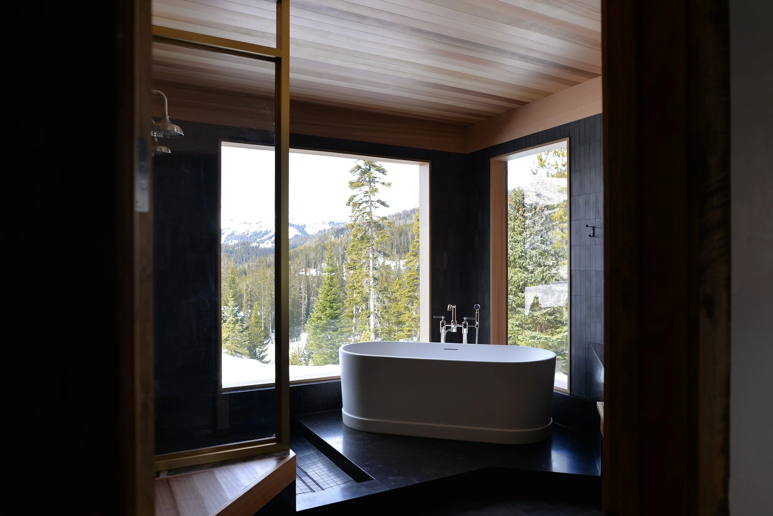 The material palate of the bathroom interior is dark and subdued, serving as quiet backdrop to the expansive and dramatic view of the Rockies. The sauna features custom cedar finishes with inlayed mahogany detailing and has a new 7-foot square window looking directly to Cedar Mountain to the west.